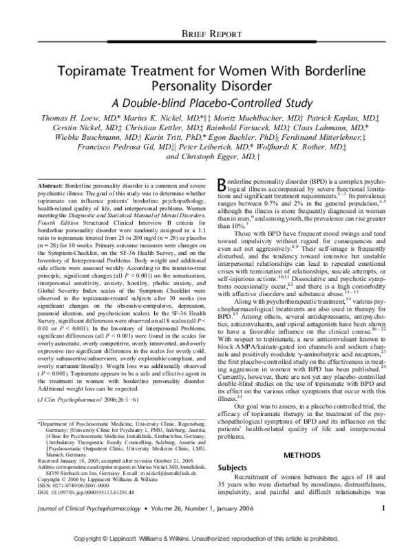 Pdf Topiramate Treatment For Women With Borderline Personality